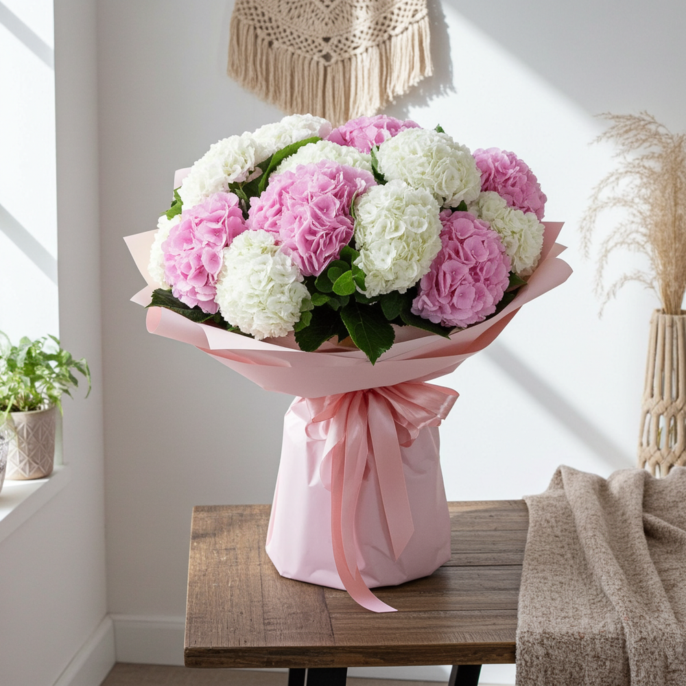 This bouquet features a stunning balance of soft pink and crisp white hydrangeas — symbolizing grace, purity, and affection. Handcrafted with care and wrapped in our signature luxury style, it’s perfect for birthdays, anniversaries, or heartfelt gestures of appreciation.