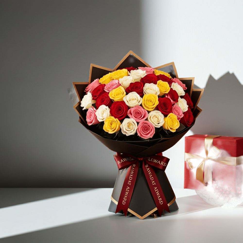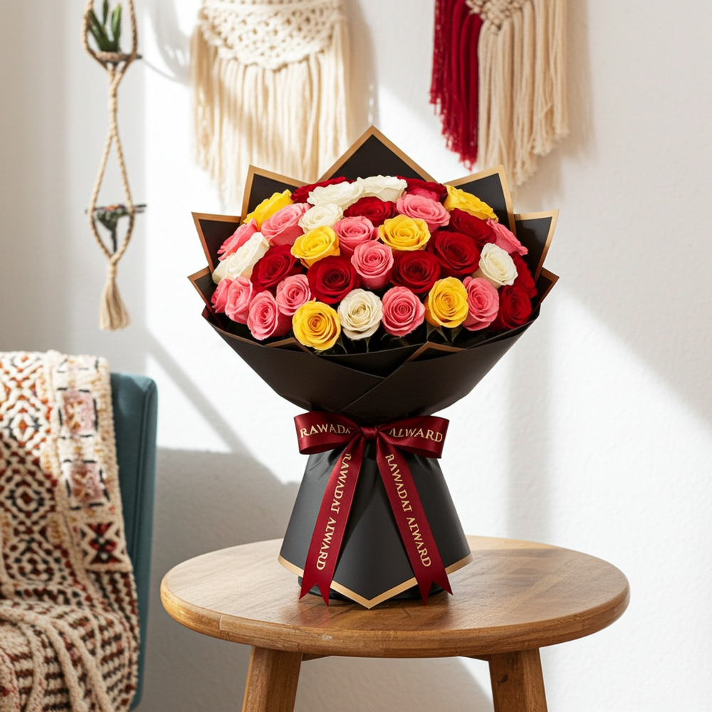 Luxury Mixed Rose Bouquet with Red, Yellow, and Pink Roses - Rawadat Al Ward