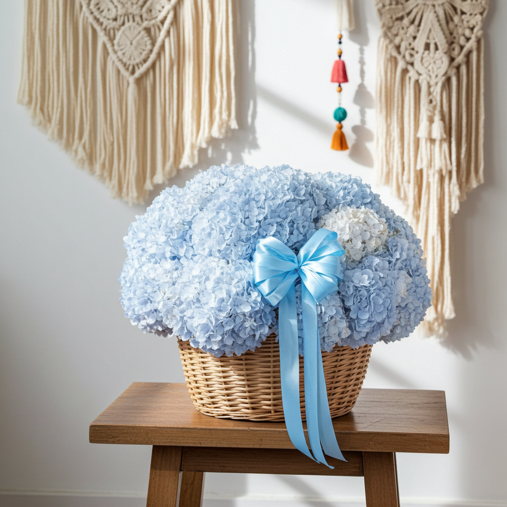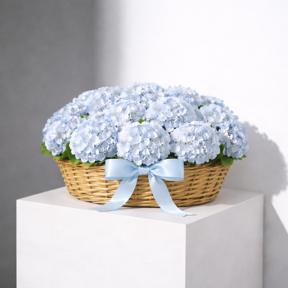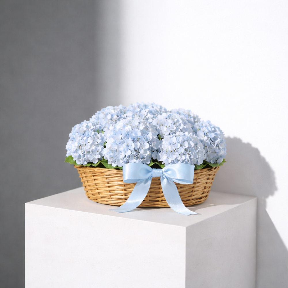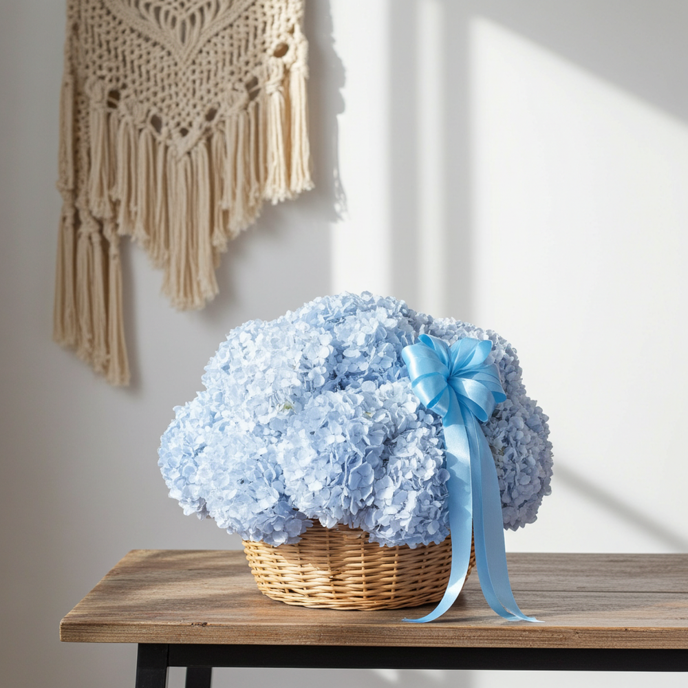 A stunning floral arrangement featuring lush blue hydrangeas artfully arranged in a rustic woven basket. This elegant floral gift is perfect for special occasions like birthdays, anniversaries, or as a symbol of admiration and appreciation. Adorned with a soft blue satin ribbon, this arrangement makes a graceful and heartfelt gesture.