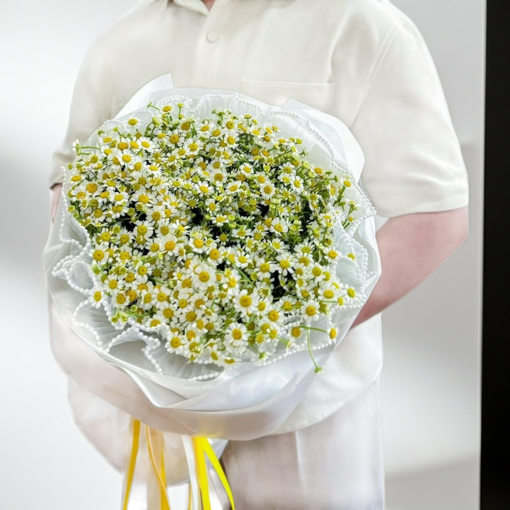 Bright, cheerful, and effortlessly elegant — our Chamomile Bliss Bouquet is a perfect blend of simplicity and charm. Featuring a lush arrangement of fresh chamomile flowers, wrapped in delicate white paper and finished with soft yellow Ribbons, this bouquet radiates positivity and warmth. Ideal for birthdays, thank-you gifts, or simply to brighten someone’s day, it captures the beauty of nature in its purest form.
