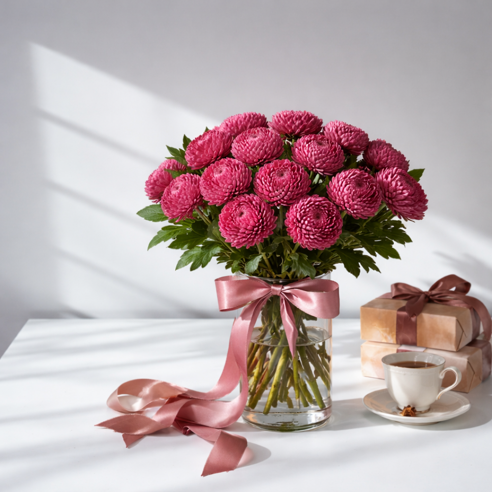 This stunning bouquet features a vibrant collection of crimson chrysanthemums, carefully arranged to highlight their full, fluffy blossoms. Known for their striking color and elegant shape, these flowers symbolize deep admiration, love, and passion. Ideal for celebrations, anniversaries, or expressing heartfelt emotions, the crimson chrysanthemums add a sophisticated and warm touch to any occasion. The rich, red petals contrast beautifully against their deep green leaves, creating a breathtaking visual effect.