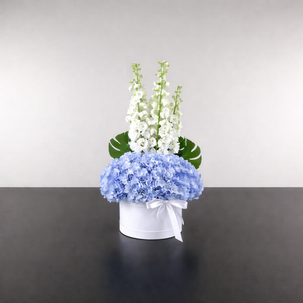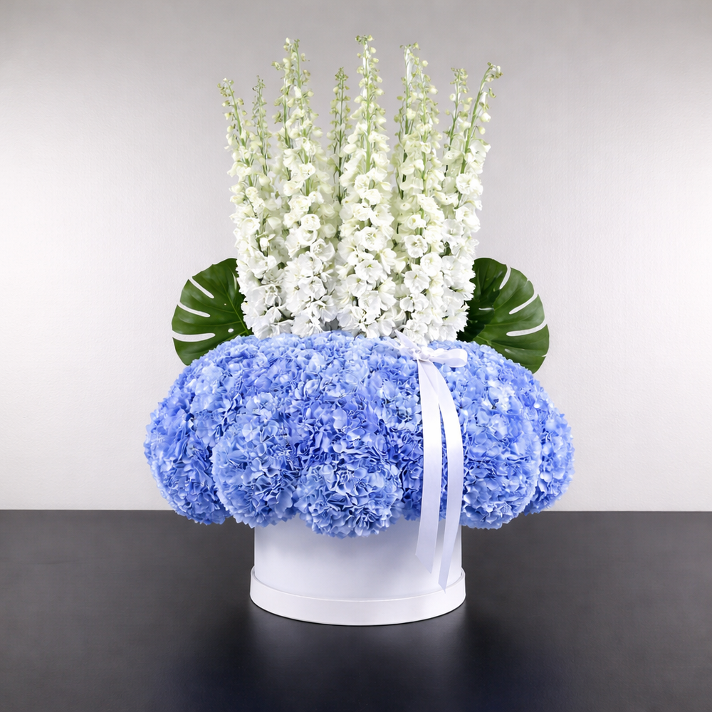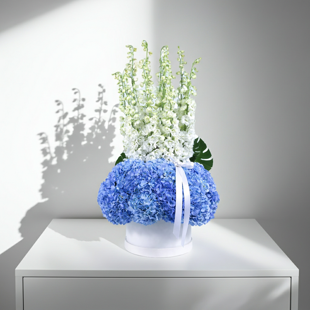 This luxurious floral arrangement features vibrant blue hydrangeas paired beautifully with tall, elegant white delphiniums, set in a pristine white hat box. The soft blue hues of the hydrangeas create a serene base, while the white delphiniums add a touch of sophistication and height to the bouquet. Tied with a delicate white satin ribbon, this arrangement is the perfect blend of beauty and elegance, making it an ideal gift for weddings, anniversaries, or any special occasion that calls for a refined floral statement.
