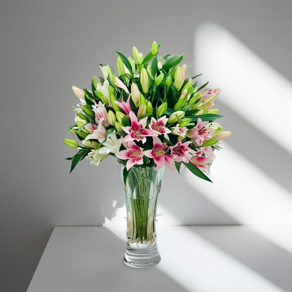 Celebrate elegance and beauty with our Elegant Pink and White Lily Bouquet, featuring a stunning mix of pink and white lilies thoughtfully arranged in a sleek glass vase. This luxurious floral arrangement captures the delicate beauty of lilies, symbolizing purity, renewal, and devotion, making it the perfect gift for birthdays, anniversaries, housewarmings, or any occasion that calls for a sophisticated touch.
