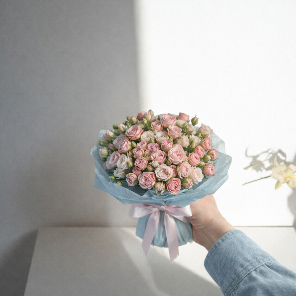Ideal for birthdays, anniversaries, or any special moment, this bouquet’s abundant roses create a striking visual display that will leave a lasting impression. The gentle mix of light pink and cream tones, combined with the elegant wrapping, makes it an exquisite gift for your loved ones.