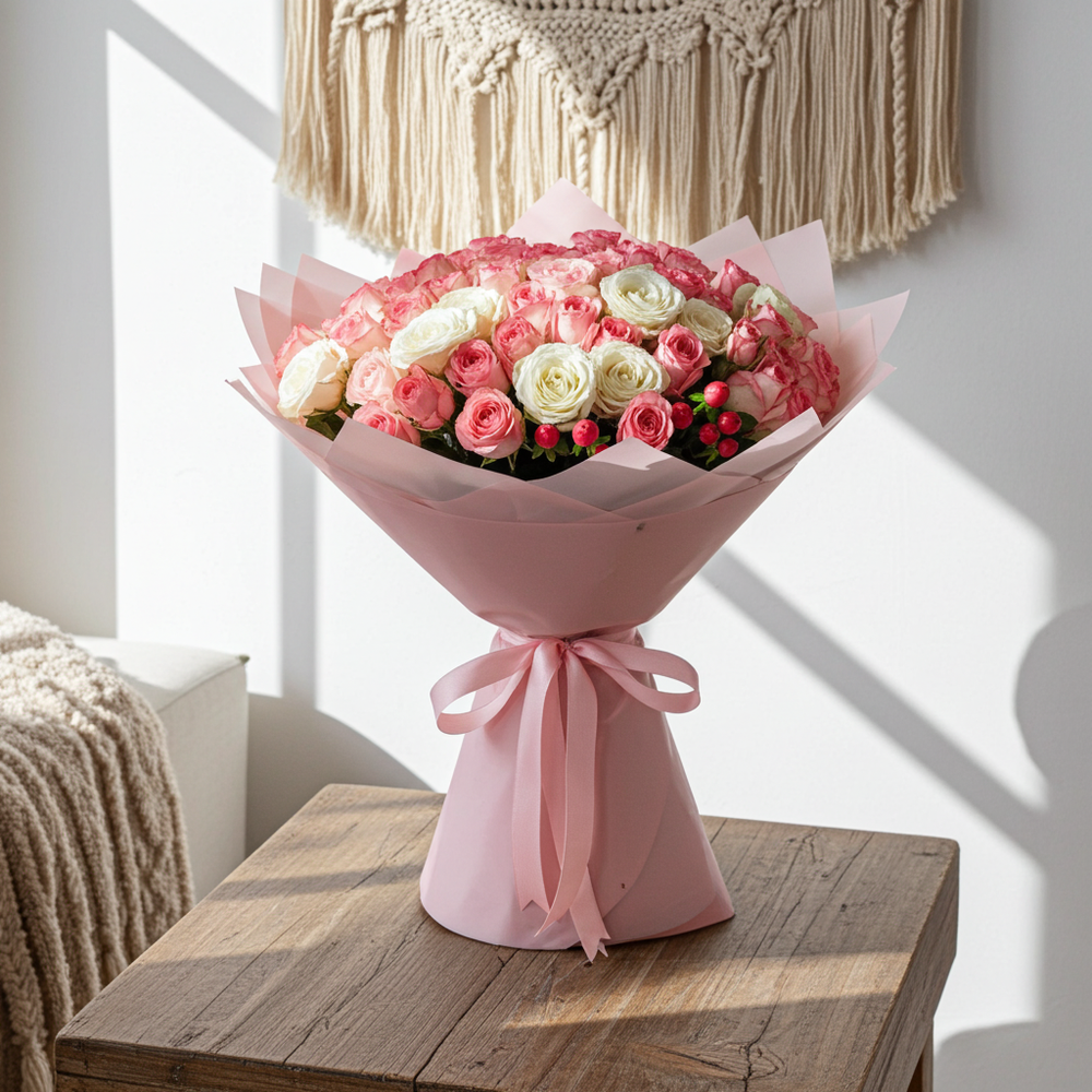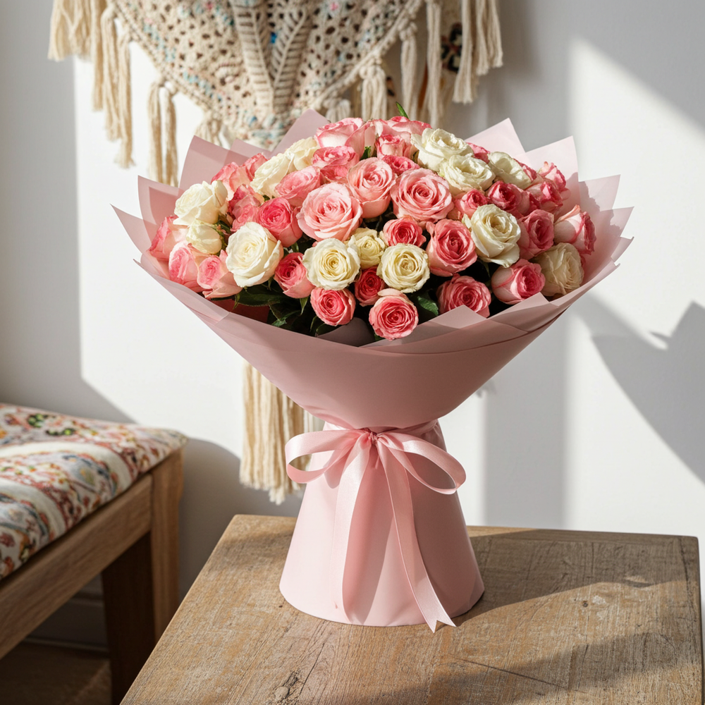 A stunning hand-tied arrangement featuring premium two-tone pink delicately wrapped in soft pink paper for a graceful finish. This bouquet radiates elegance, tenderness, and charm — perfect for expressing love, admiration, or heartfelt appreciation. Ideal for birthdays, anniversaries, or any special occasion that deserves a touch of classic beauty.