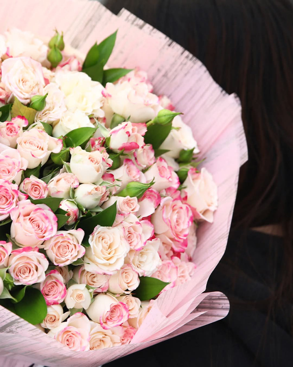 This luxurious bouquet features a harmonious blend of soft pink and delicate white roses, wrapped in elegant pink pleated paper and tied with a satin ribbon bow. Designed to make any occasion unforgettable, this bouquet is a symbol of love, grace, and beauty.