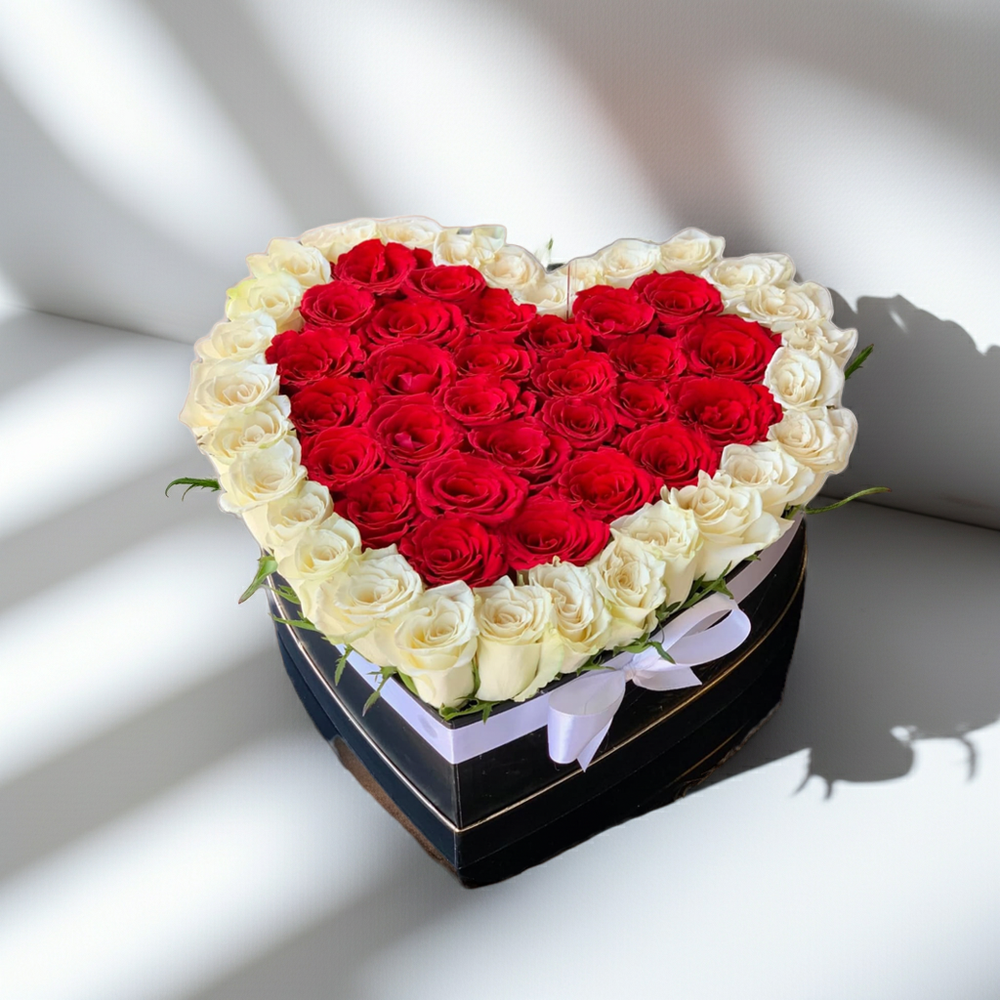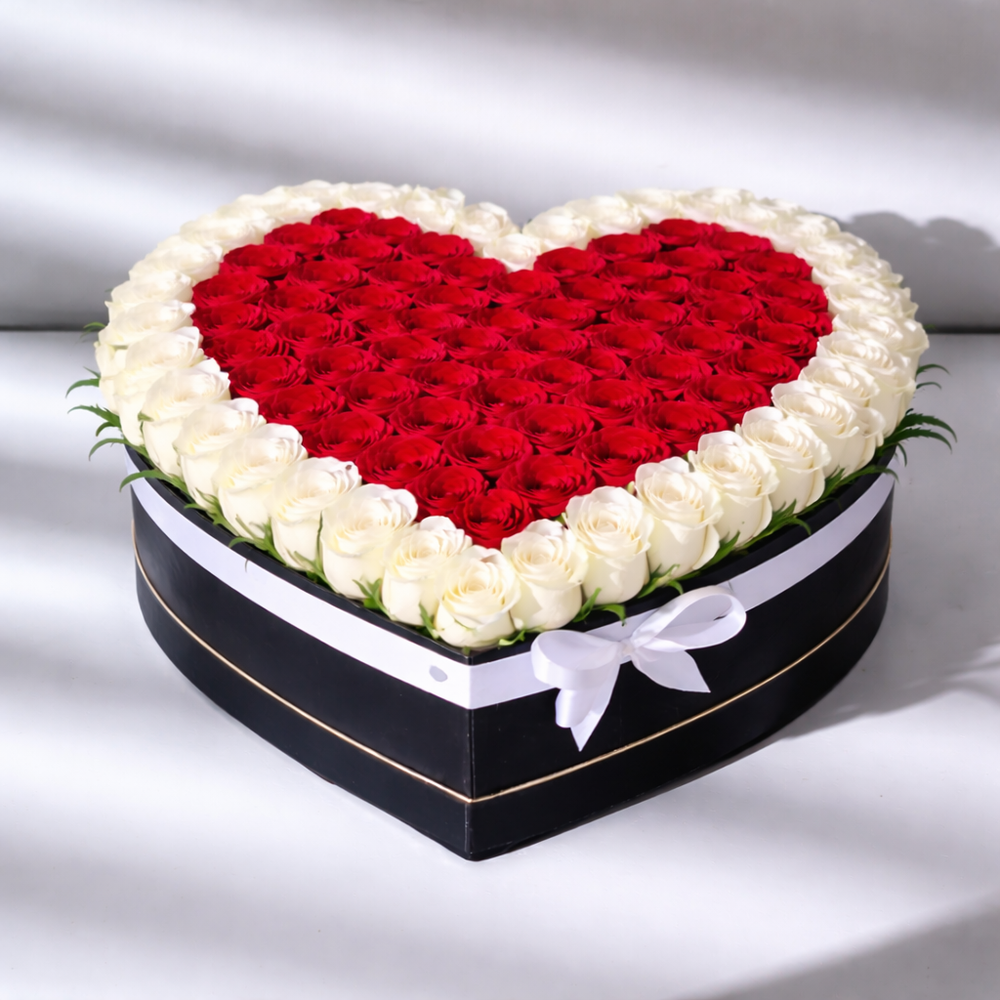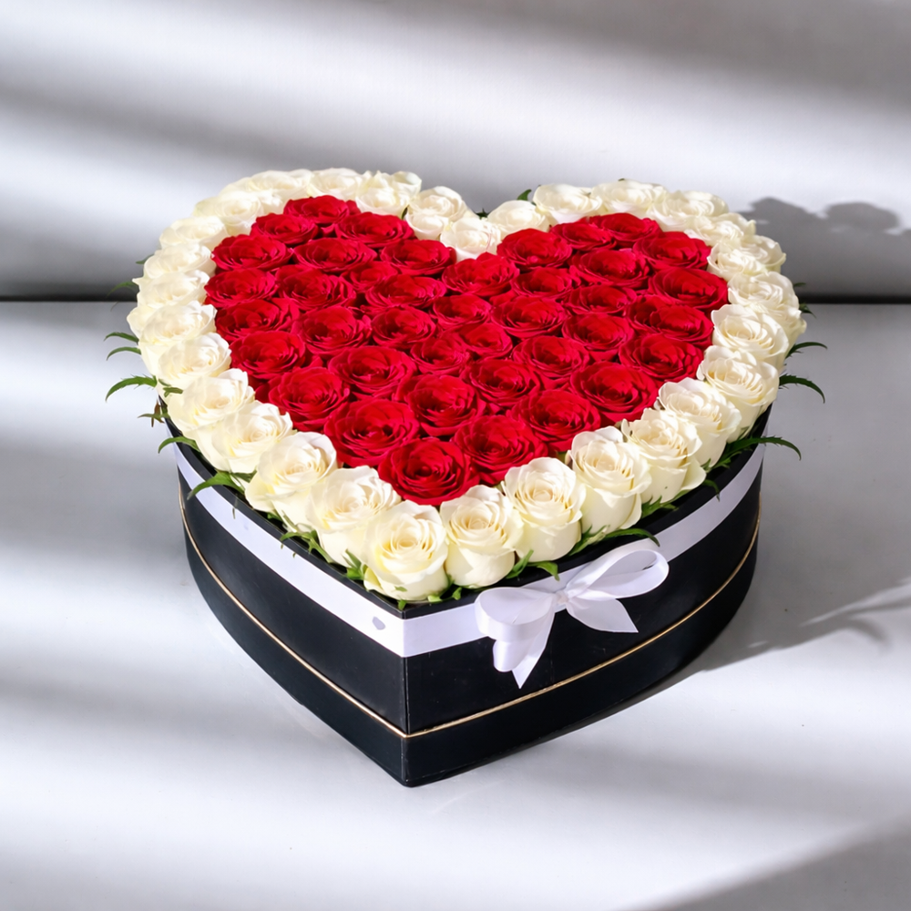 he rich red roses in the center symbolize deep love and affection, while the white roses surrounding the heart add elegance, purity, and grace. Arranged in a stylish black box and finished with a delicate white ribbon, this bouquet is not just a gift but a statement of deep emotions and romantic admiration.