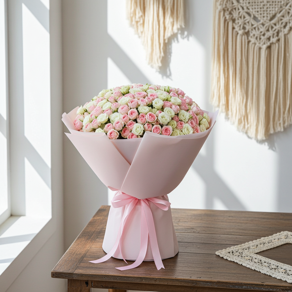 This luxurious hand-tied bouquet features hundreds of fresh spray roses in a delicate blend of pastel pink and ivory white tones. Each bloom is carefully selected for its softness, fullness, and natural beauty, creating a rich and voluminous floral arrangement that stands out in any setting