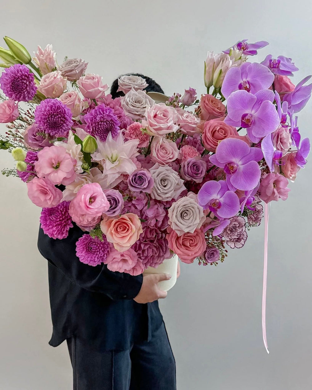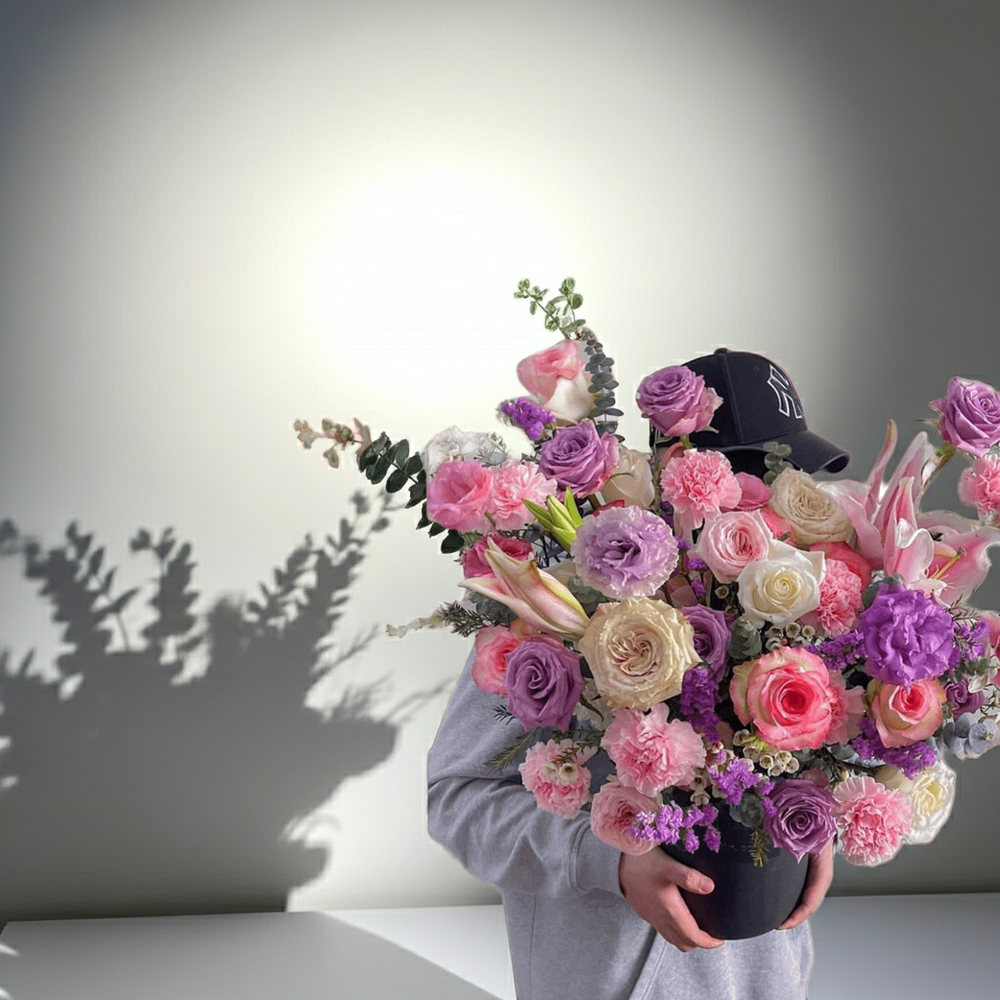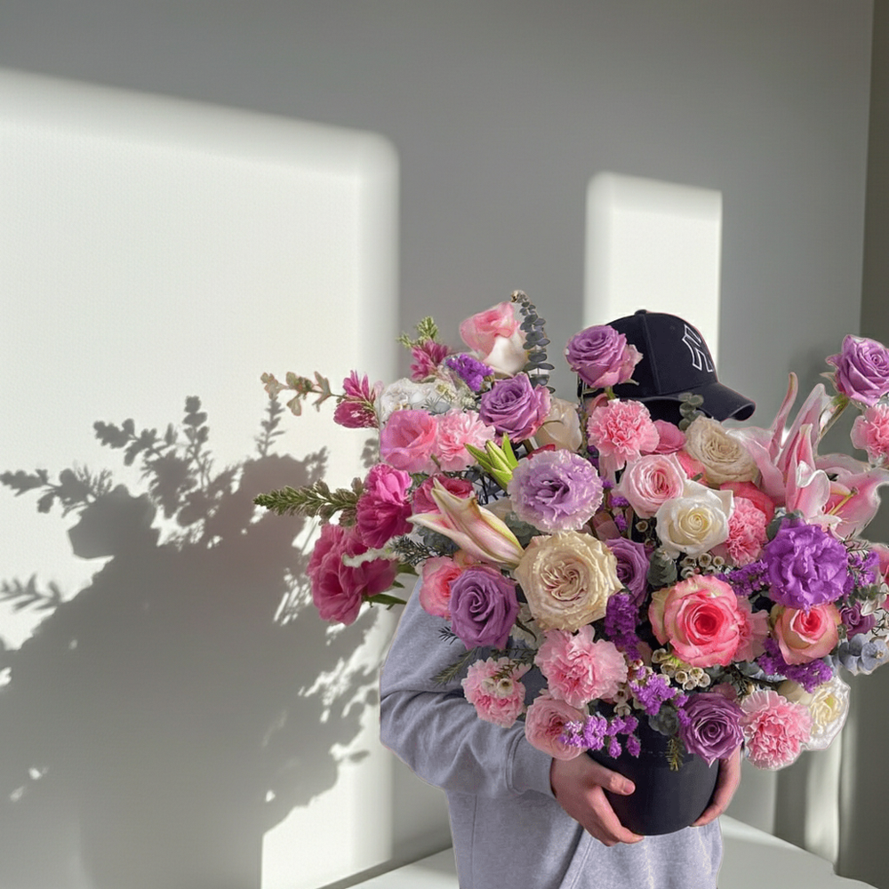 This Lavender Bliss bouquet captures the serene beauty of soft pastels, combining lush lavender roses, delicate pink carnations, and creamy white lilies to create a harmonious, graceful arrangement. Each bloom is carefully selected to evoke feelings of calm and elegance,