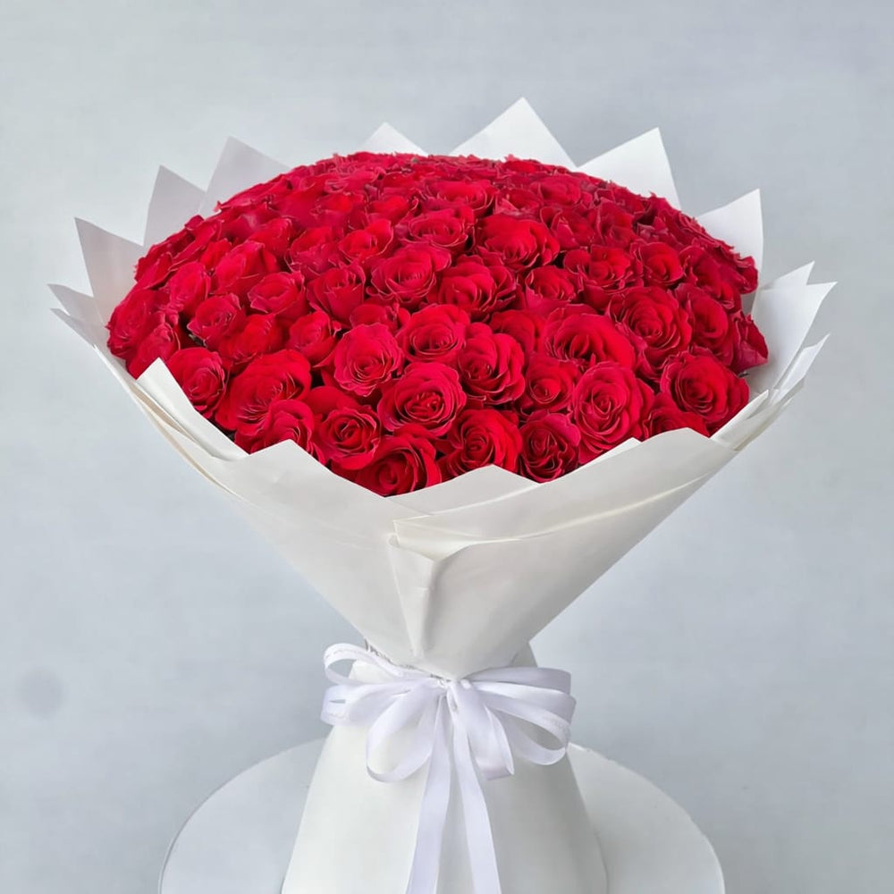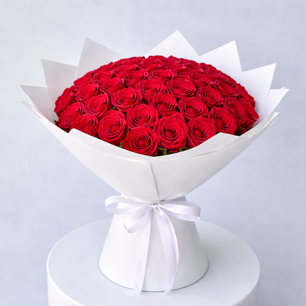The bouquet showcases a full, round shape made up of carefully arranged rich red roses, symbolizing deep love and admiration. The sleek white paper wrap and soft white ribbon add a touch of elegance and refinement, making this arrangement not just a gift, but a statement of beauty and affection.
