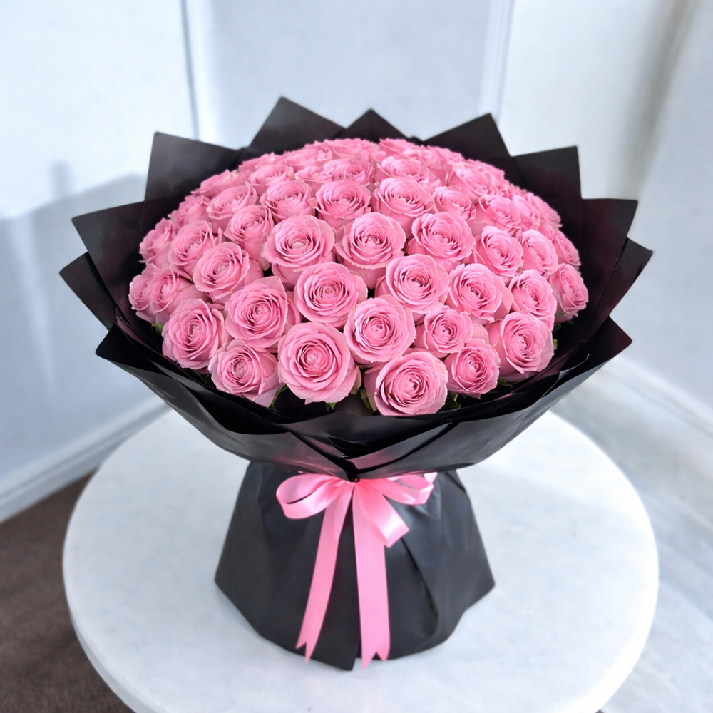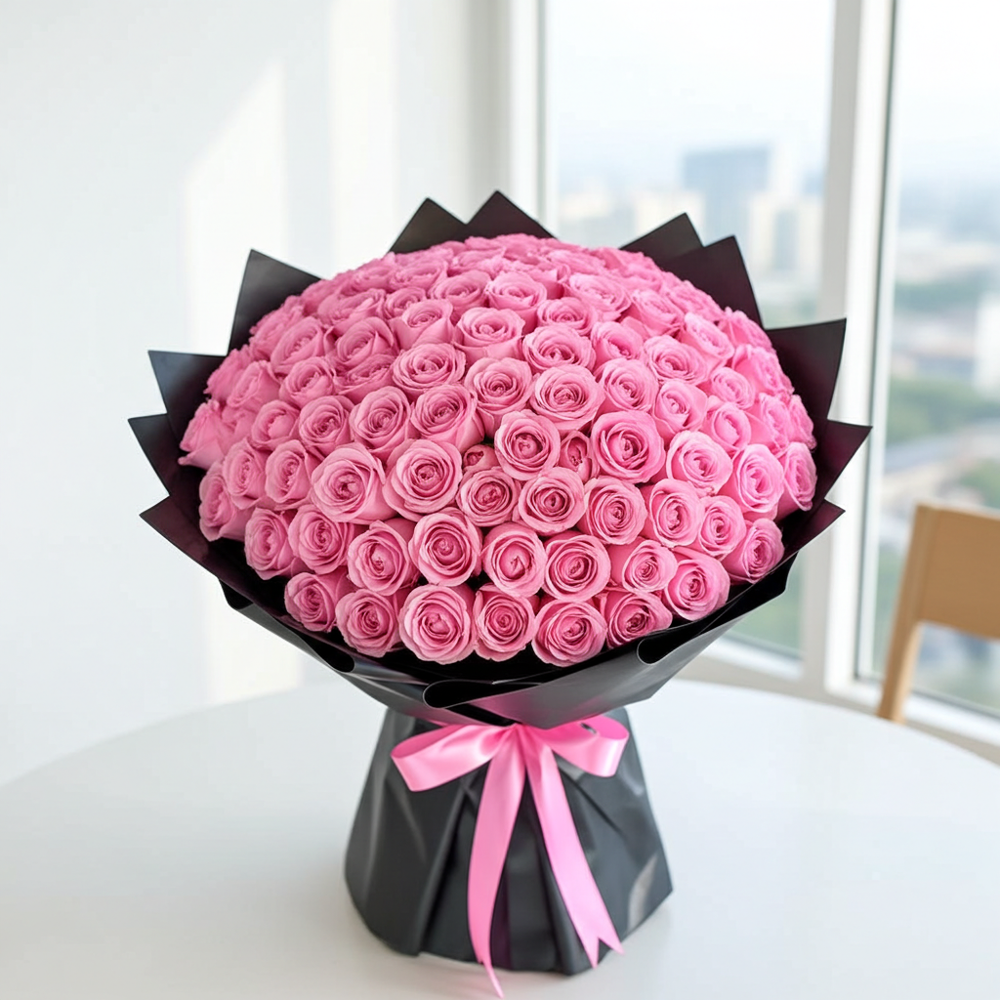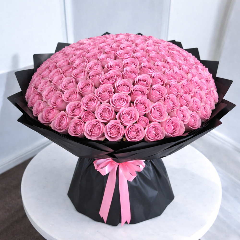 Surprise your loved one with this stunning bouquet of pink roses. Arranged with care, this beautiful floral gift is perfect for any occasion, including birthdays, anniversaries, or a romantic gesture. Featuring 100 premium pink roses, this luxurious bouquet comes wrapped in elegant black paper with a soft pink ribbon, adding a touch of sophistication to your gift. Ideal for expressing love, appreciation, or admiration