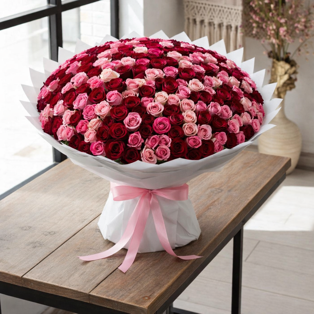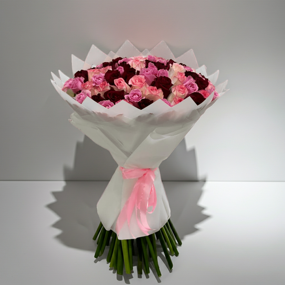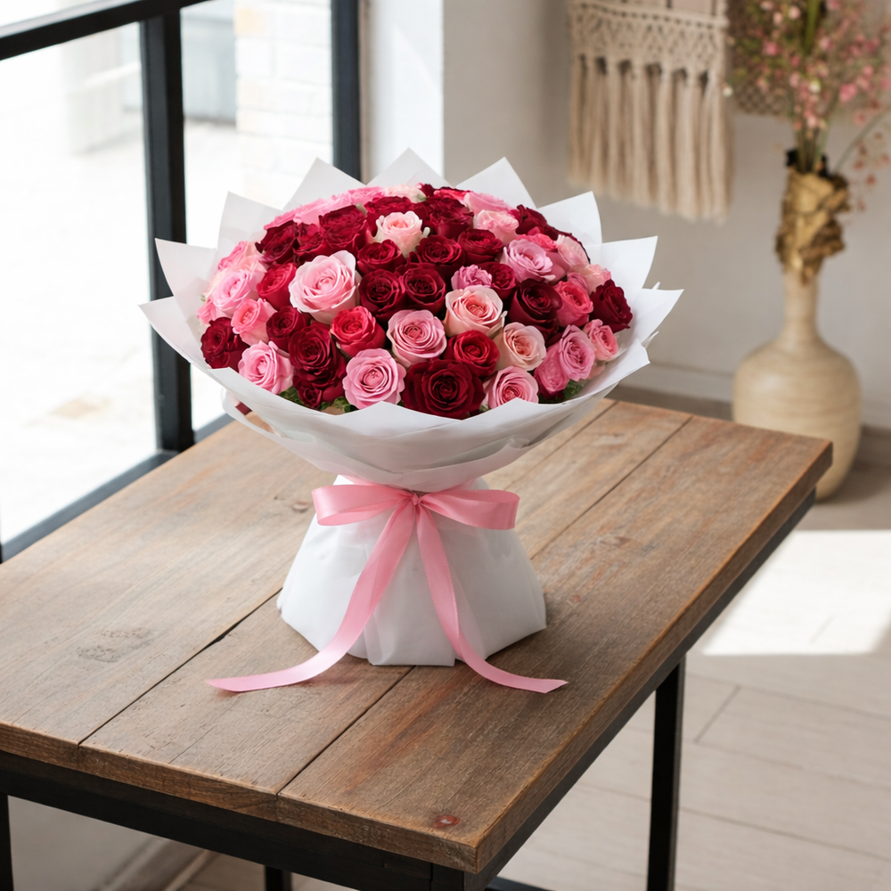 Enhance any occasion with this breathtaking bouquet, a beautiful blend of soft pink and rich burgundy roses. Carefully arranged to create a luxurious and elegant display, this bouquet is