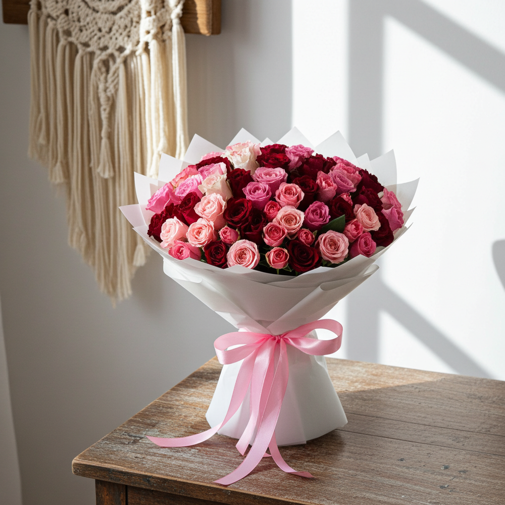 Perfect for expressing love, gratitude, or appreciation. Wrapped in delicate white paper and tied with a pink satin ribbon, it makes an unforgettable gift for birthdays, anniversaries, or special moments. Let these stunning roses add a touch of beauty and elegance to any event or space. Freshly sourced, our roses offer long-lasting beauty and fragrance.