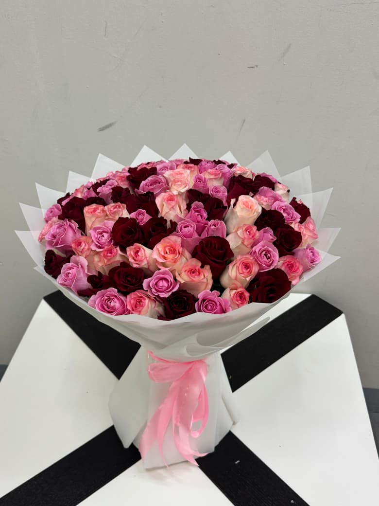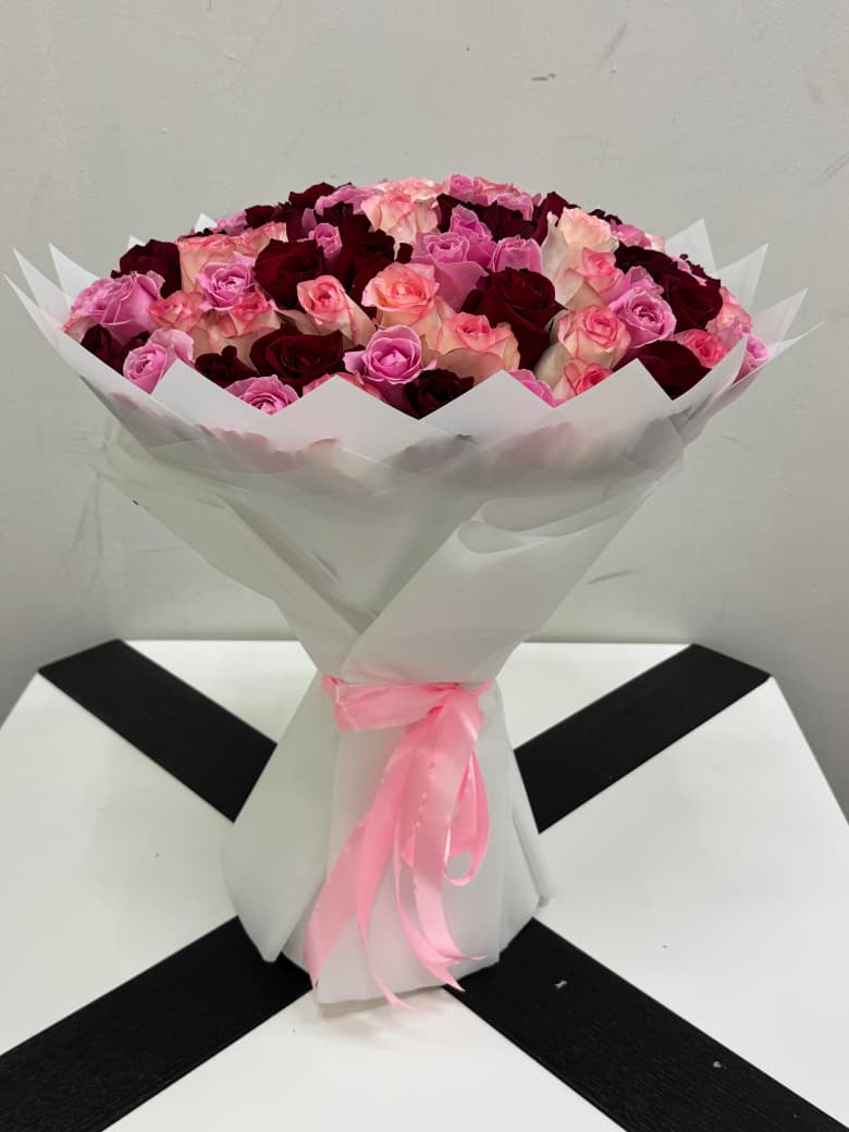 Enhance any occasion with this breathtaking bouquet, a beautiful blend of soft pink and rich burgundy roses. Carefully arranged to create a luxurious and elegant display, this bouquet isย