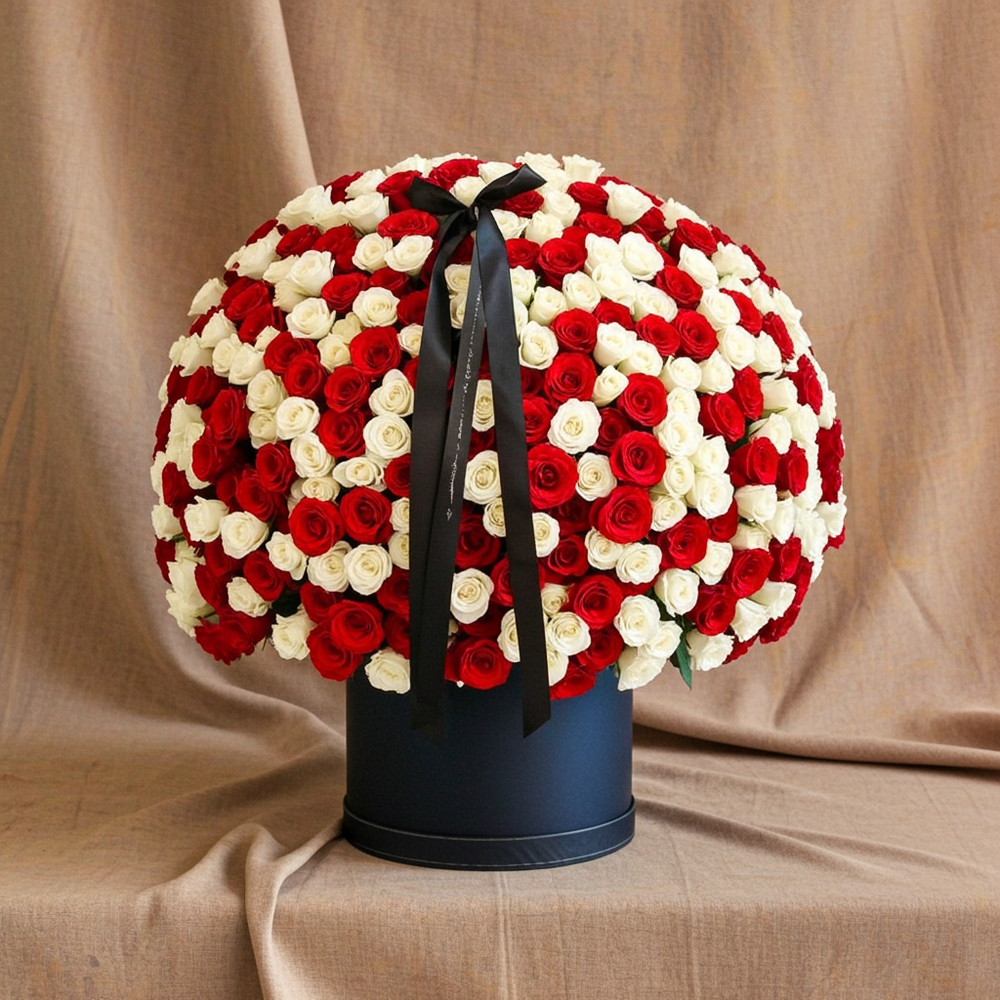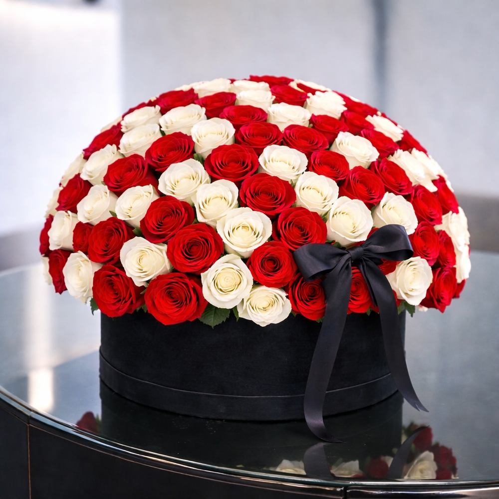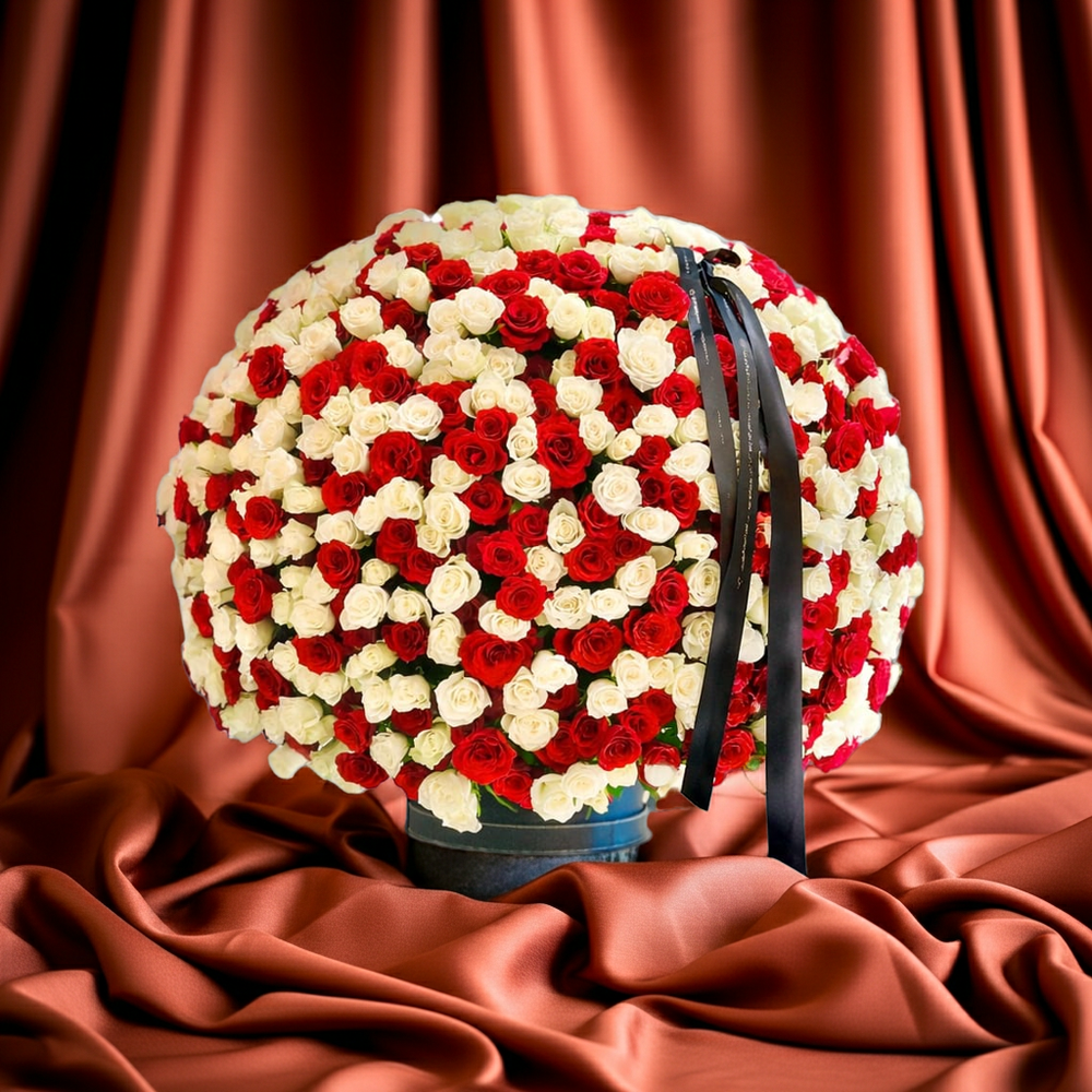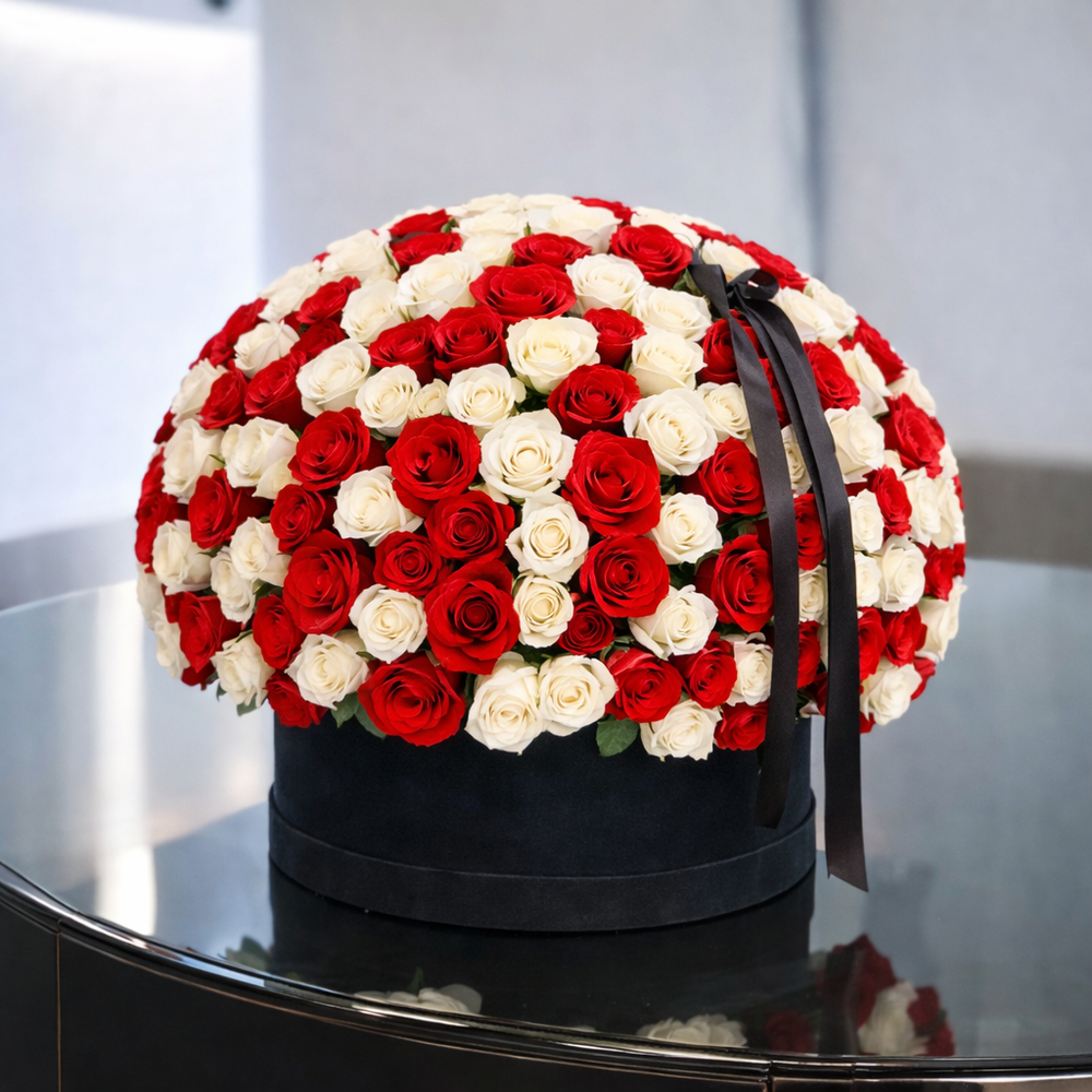 Bring elegance and sophistication to any occasion with our Luxury Red and White Rose Arrangement. Carefully crafted with the finest red and white roses, this breathtaking bouquet is designed to make a lasting impression. The stunning round shape and intricate arrangement create a harmonious blend of beauty and class,
