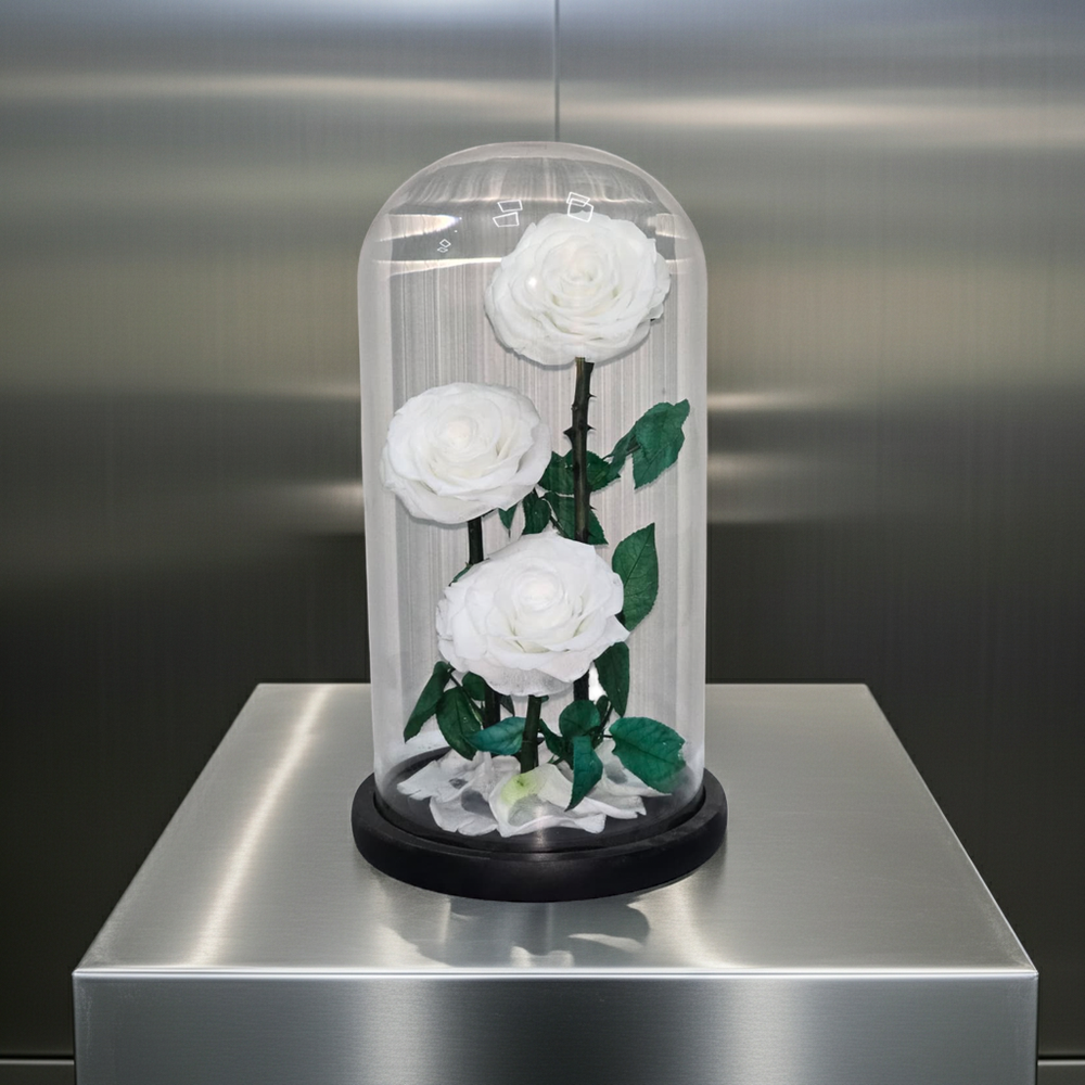 Preserved white roses, roses in glass dome, eternal white roses, wedding flowers, anniversary gift, preserved flowers, floral arrangement, luxury flower display, elegant home décor, lasting flowers, thoughtful gift, timeless roses, flower gift, home decoration"