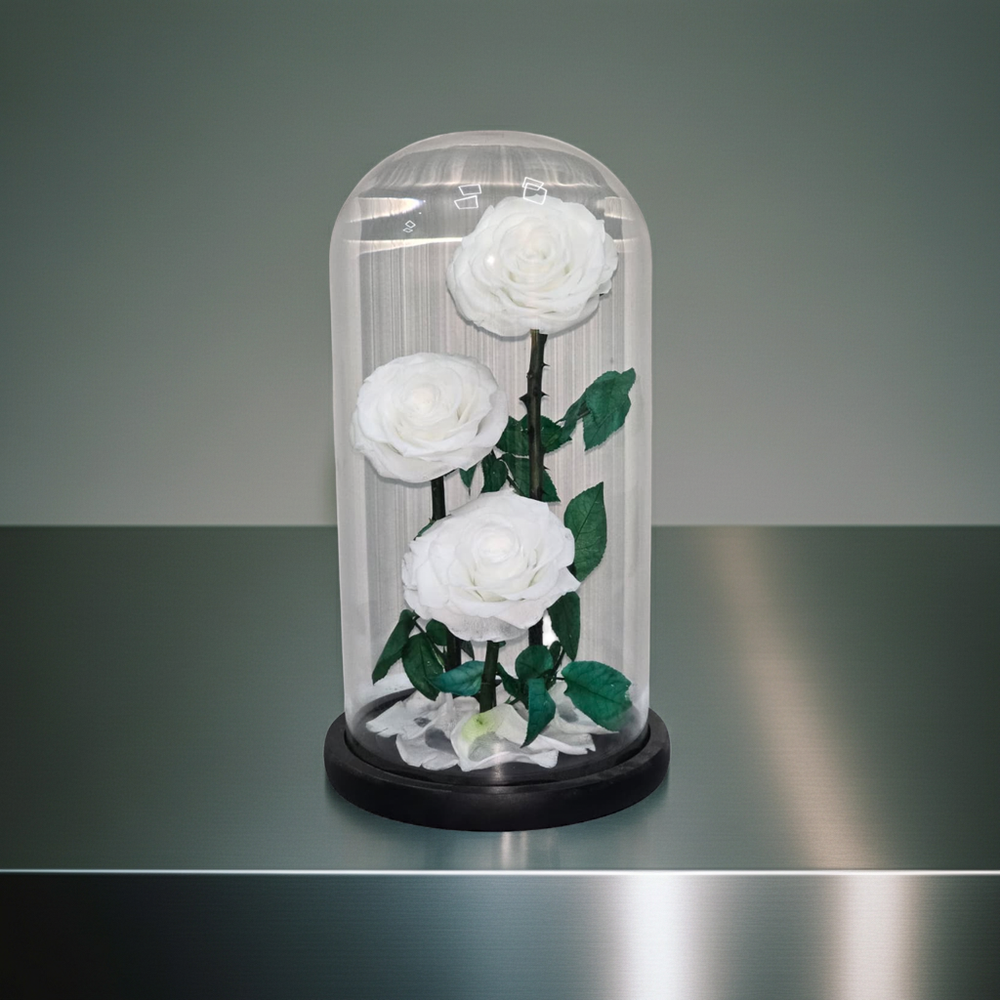 Add a touch of elegance to your space with these preserved white roses displayed in a glass dome. These timeless flowers symbolize purity and grace, making them perfect for weddings, anniversaries, or as a thoughtful gift for someone special. Carefully preserved to maintain their natural beauty, these roses stay fresh-looking for years, offering a lasting reminder of love and beauty. This exquisite floral arrangement is perfect for any home décor or as a luxurious gift for loved ones