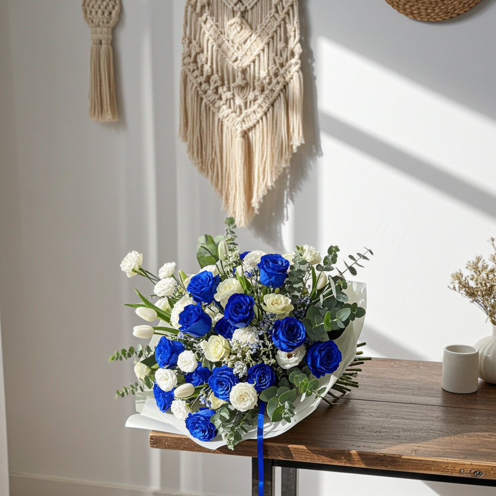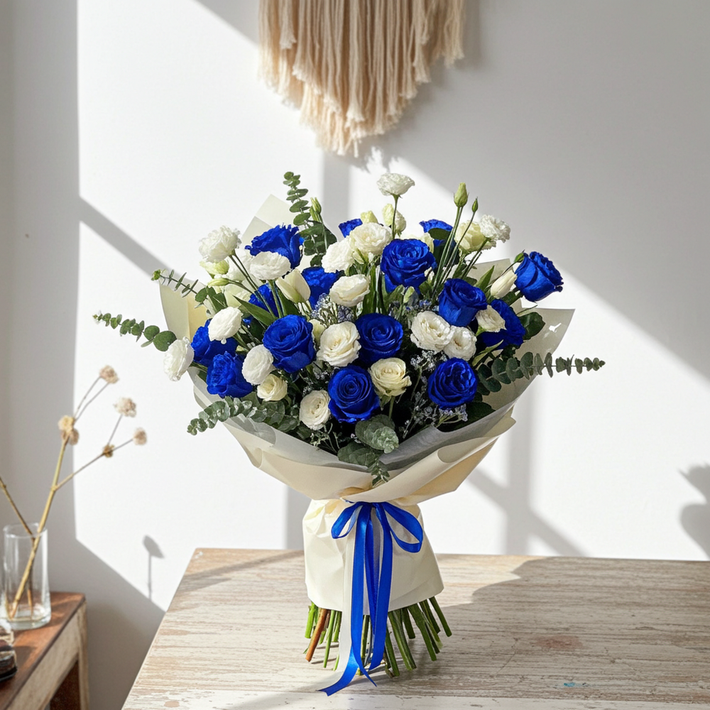 This exquisite bouquet combines the richness of royal-blue roses with the timeless beauty of white tulips, carnations, and lisianthus, arranged with premium greens for added depth and freshness.
